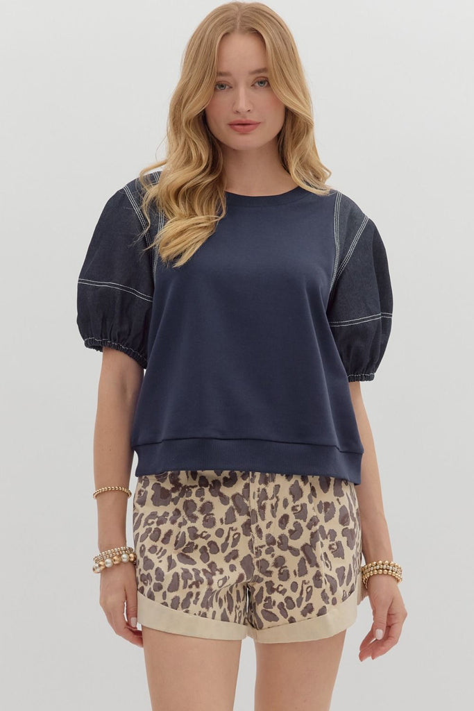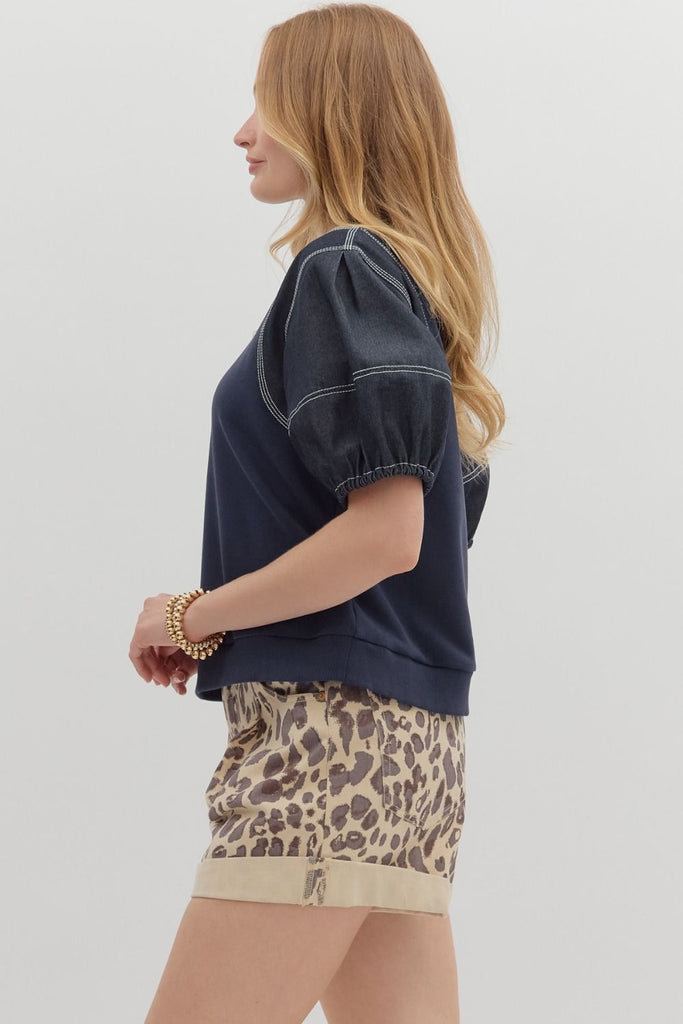 Indigo Contrast Stripe Puff Sleeve Sweater