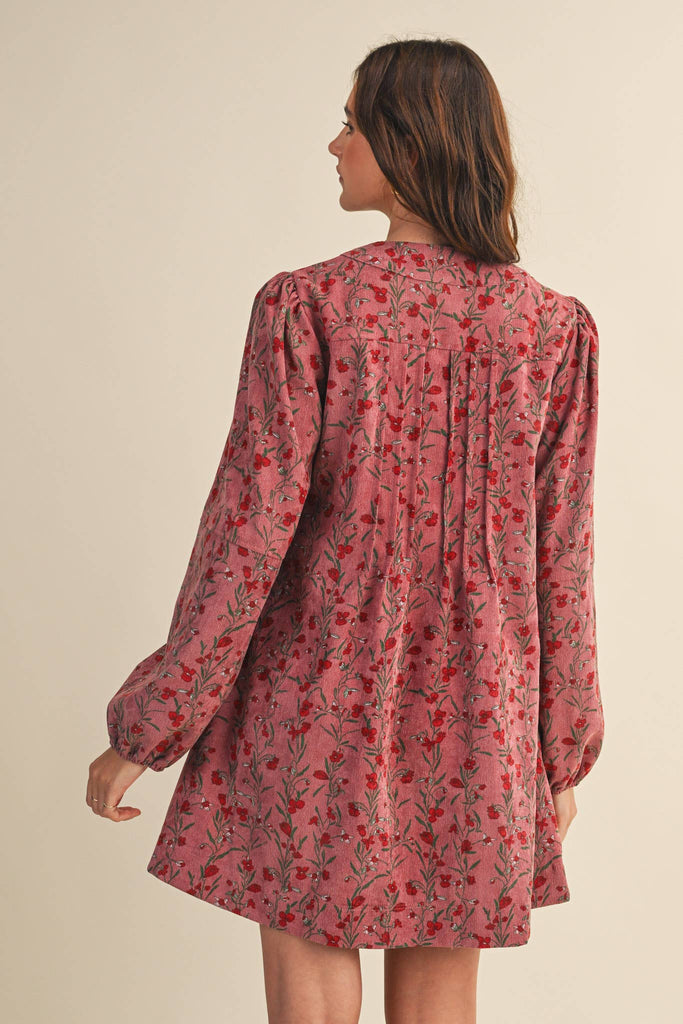 Fall Floral corduroy mini dress + V neckline with tying closure + Pin tuck detail on front and back + Long puff sleeves with elastic cuffs + Shift silhouette + Pockets