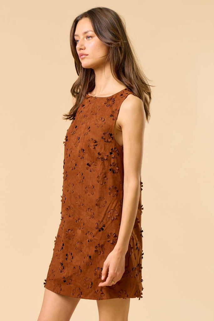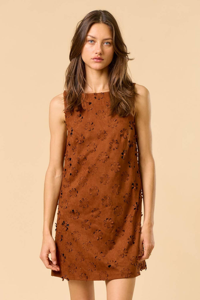 Flower Cut-Out Suede Dress This elegant dress combines the luxurious texture of suede with intricate flower cut-out details, creating a harmonious blend of sophistication and femininity. The figure-flattering silhouette and carefully crafted design make it a standout piece for various occasions. Great for fall looks, evening looks and brunch.
