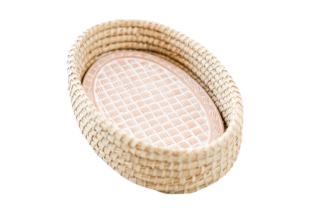 This bread warmer features a whitewashed terracotta stone, beautifully incised with a weave design. The stone is oven-safe, and this item is a favorite of many customers. Keep bread, rolls, muffins, or tortillas toasty with this charming warmer- an ideal gift for any occasion.